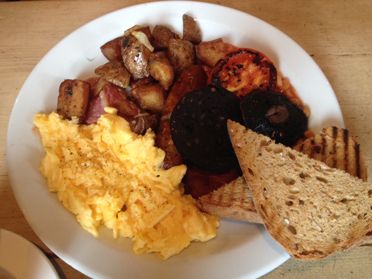 A pretty picture it isn’t but if you’re looking for a warming, filling start to the day you’ve got it. Boston Beans is basically a bowl filled with slow cooked pork, barbecued beans, onions and chopped potato, with a poached egg on top. We added avocado to ours (not pictured) for a small cost which added a real creaminess to it.