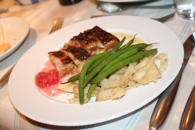 Main: Roast belly of pork with marmalade verjuice glaze, rhubarb and plum relish with seasonal vegetables